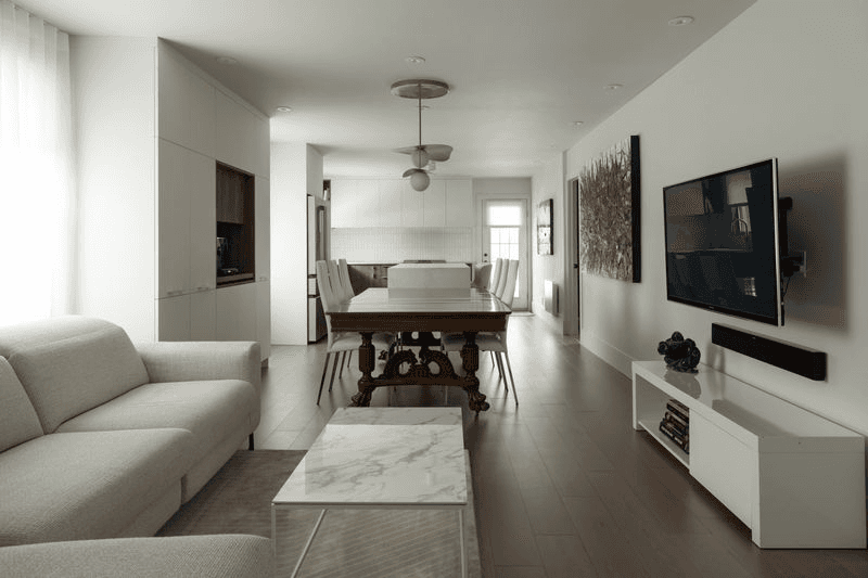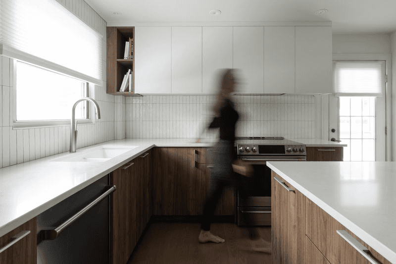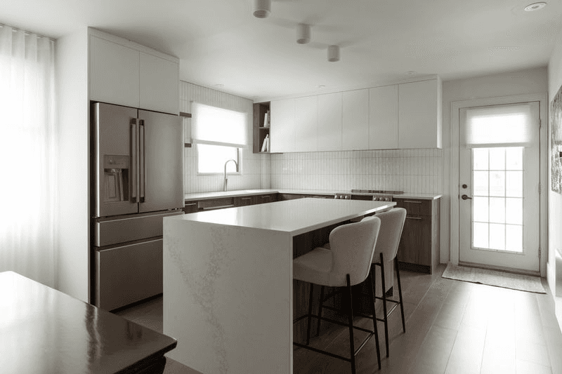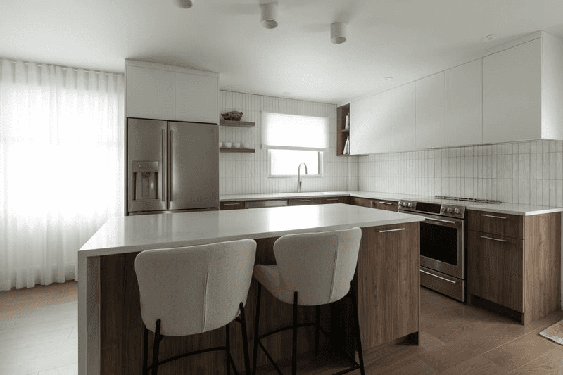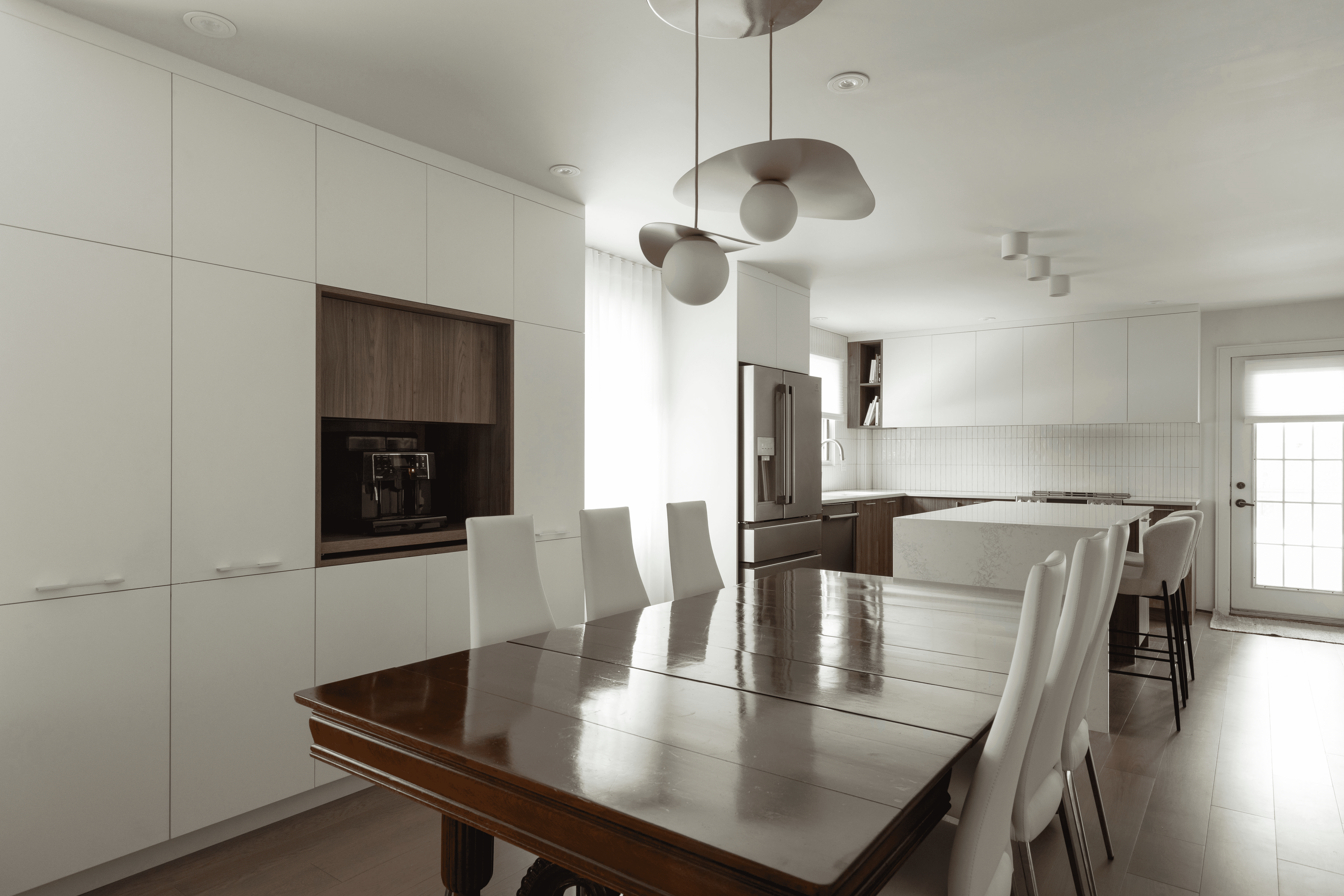 Projet réalisé à Saint-Lambert : rénovation complète du rez-de-chaussée et du sous-sol. Le mandat consistait à ouvrir entièrement les espaces afin de créer une cuisine conviviale avec coin déjeuner et penderie intégrée, répondant à un important manque de rangement. Les teintes de bois foncées et chaleureuses s’harmonisent à un blanc cassé lumineux, pour un résultat à la fois élégant, fonctionnel et enveloppant.